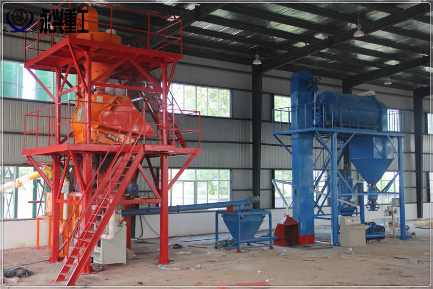 無(wú)機保溫砂漿母料(水泥、砂子、添加劑等)經(jīng)微機自動(dòng)計量配料提升至臥式無(wú)重力攪拌機,混合3-5分鐘?;旌暇鶆虻哪噶辖?jīng)提升機(或螺旋輸送機)進(jìn)入母料過(guò)渡倉,再經(jīng)二次微機配料進(jìn)入無(wú)軸滾筒混合機,同時(shí)?;⒅樘嵘翝L筒混合機,經(jīng)短時(shí)混合后進(jìn)入成品倉。